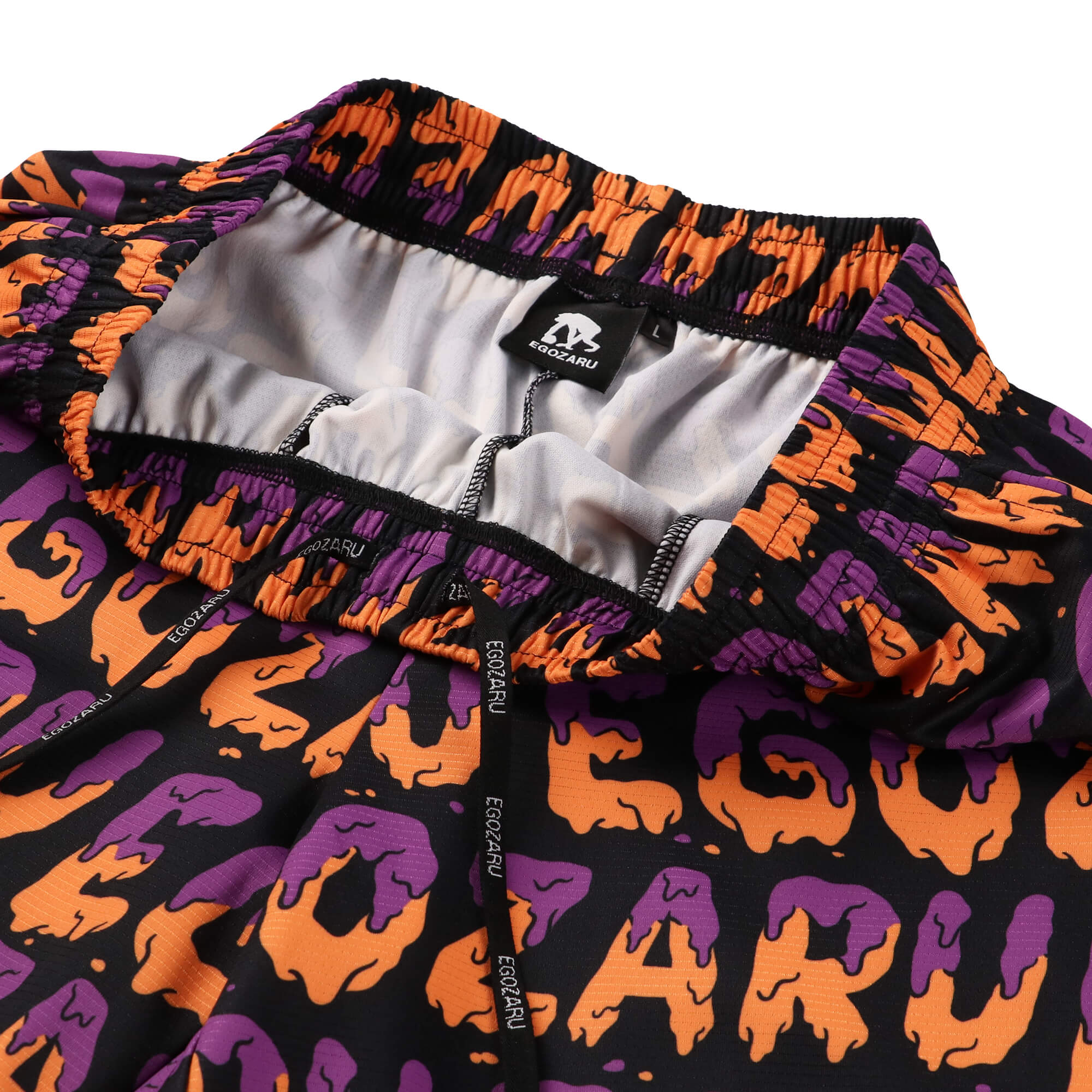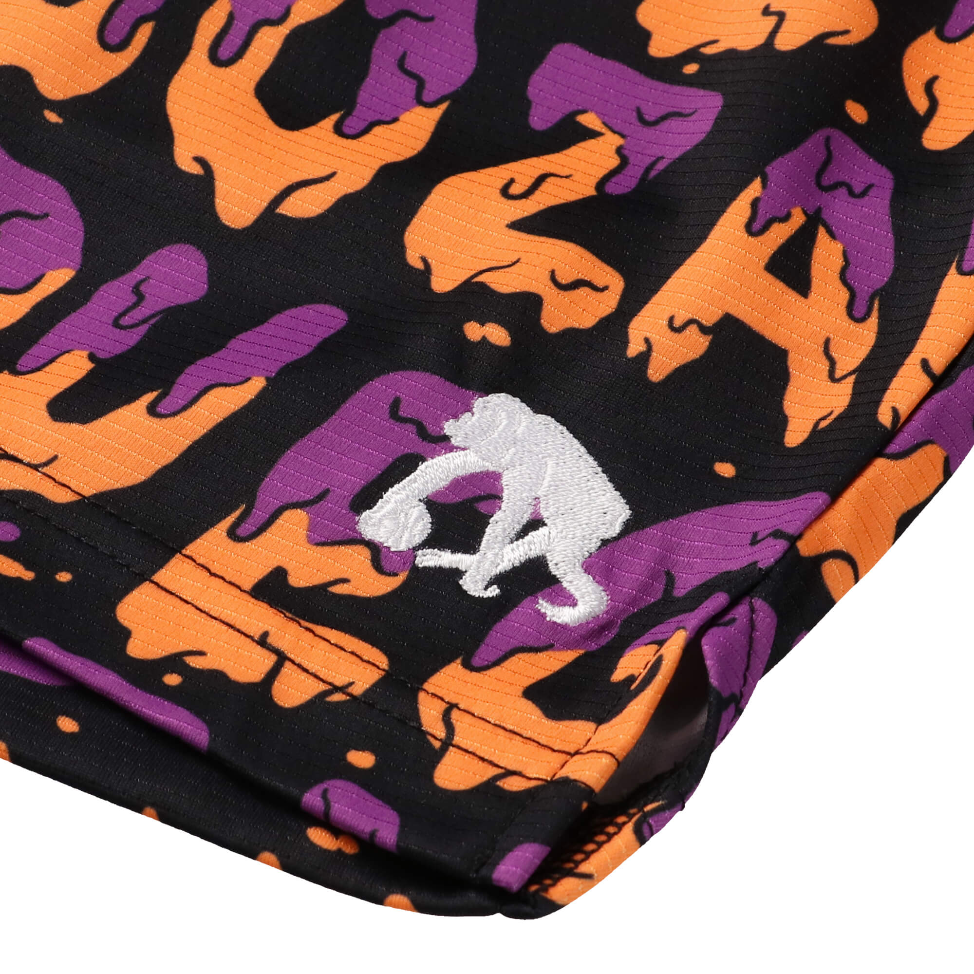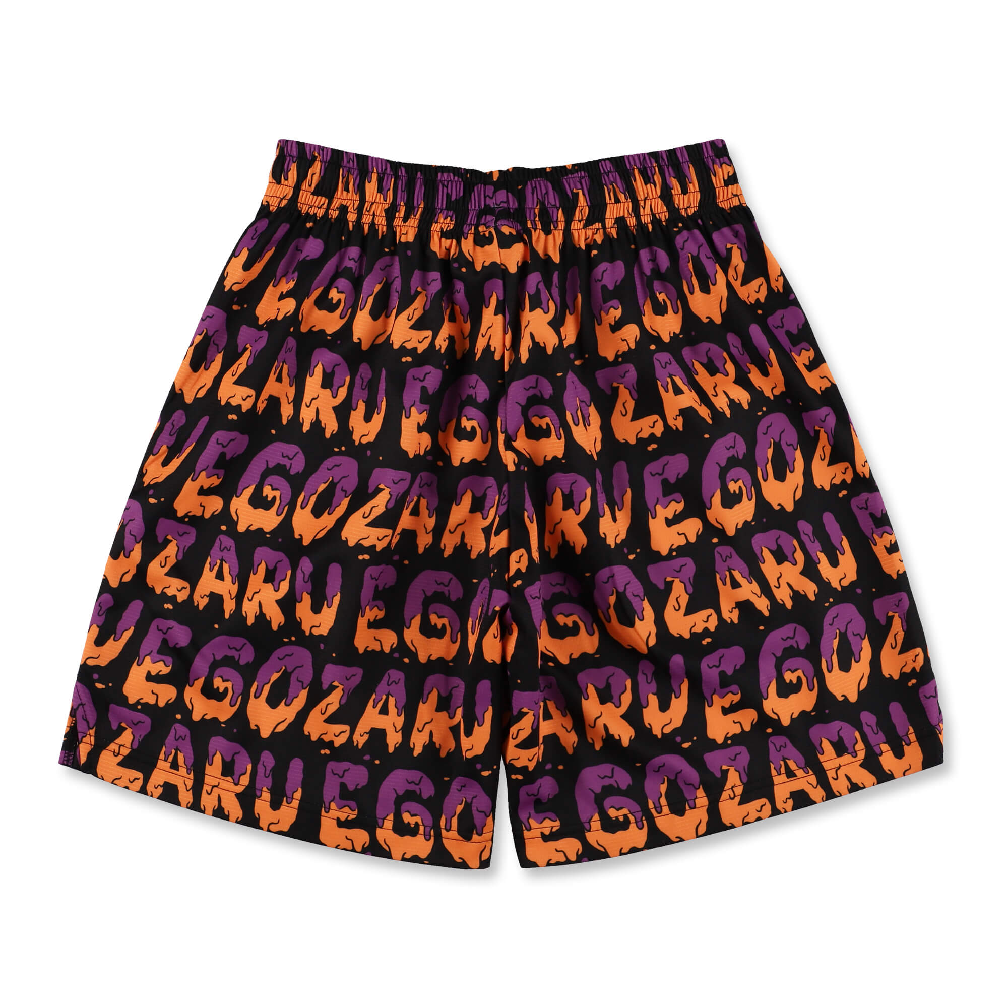 ホラーテイストのクリーピーロゴを全面に配した、ひざ上丈シルエットのショートパンツ。