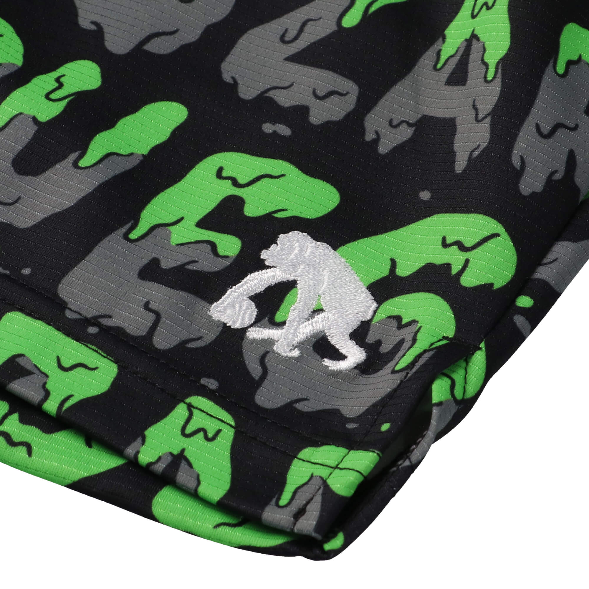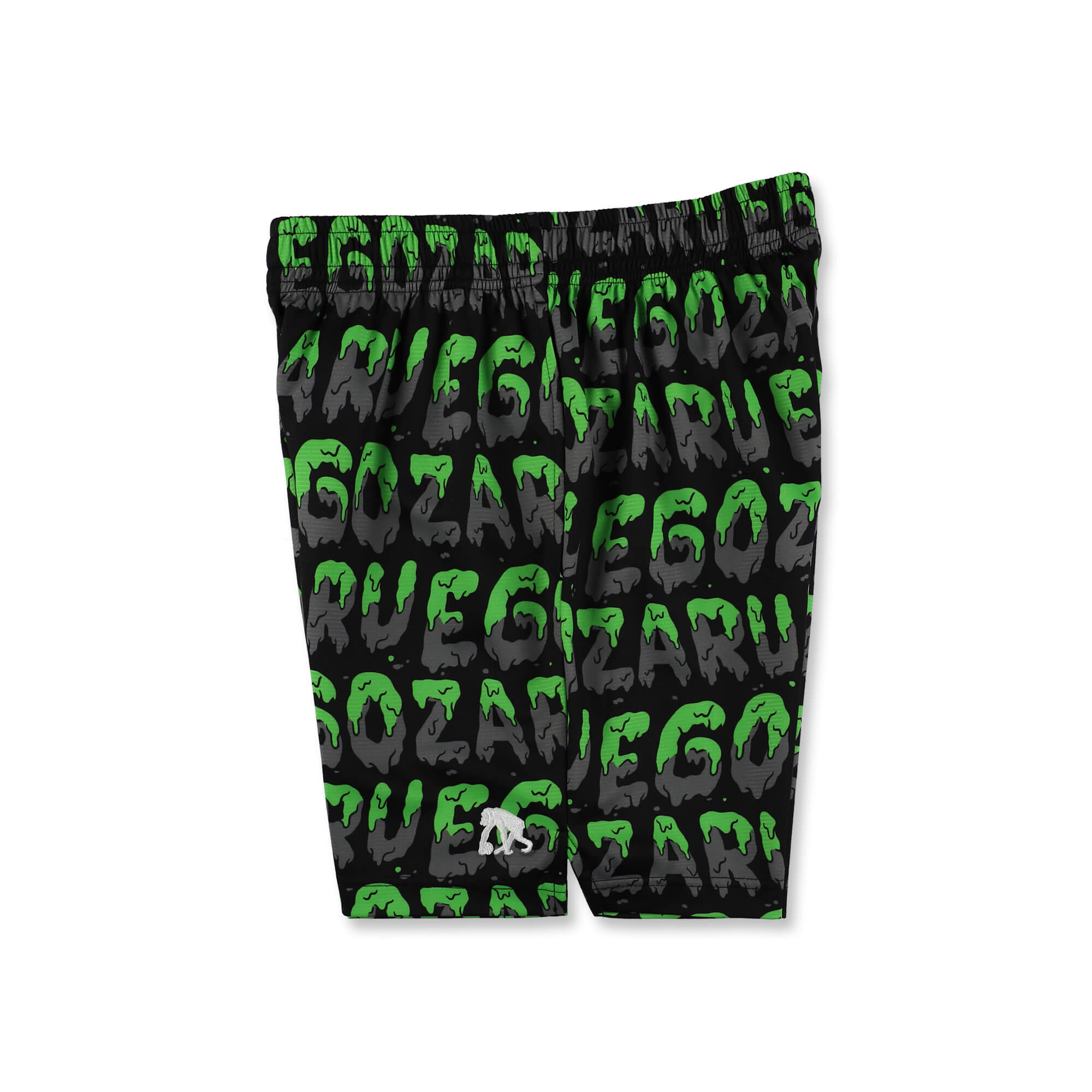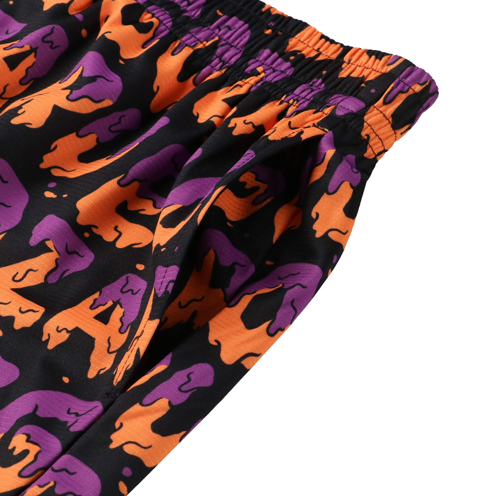 ホラーテイストのクリーピーロゴを全面に配した、ひざ上丈シルエットのショートパンツ。