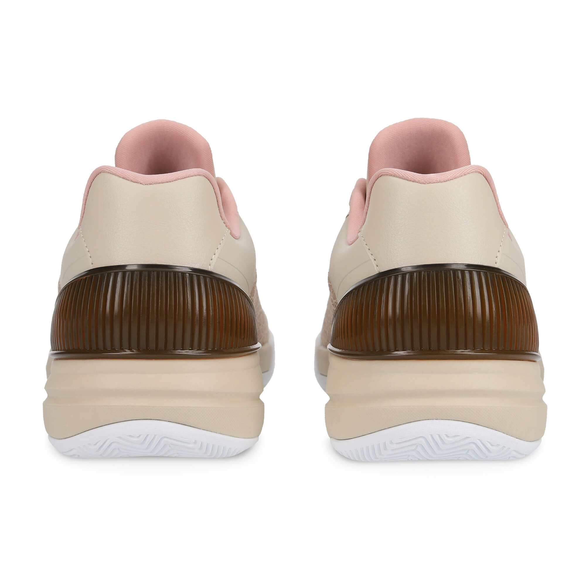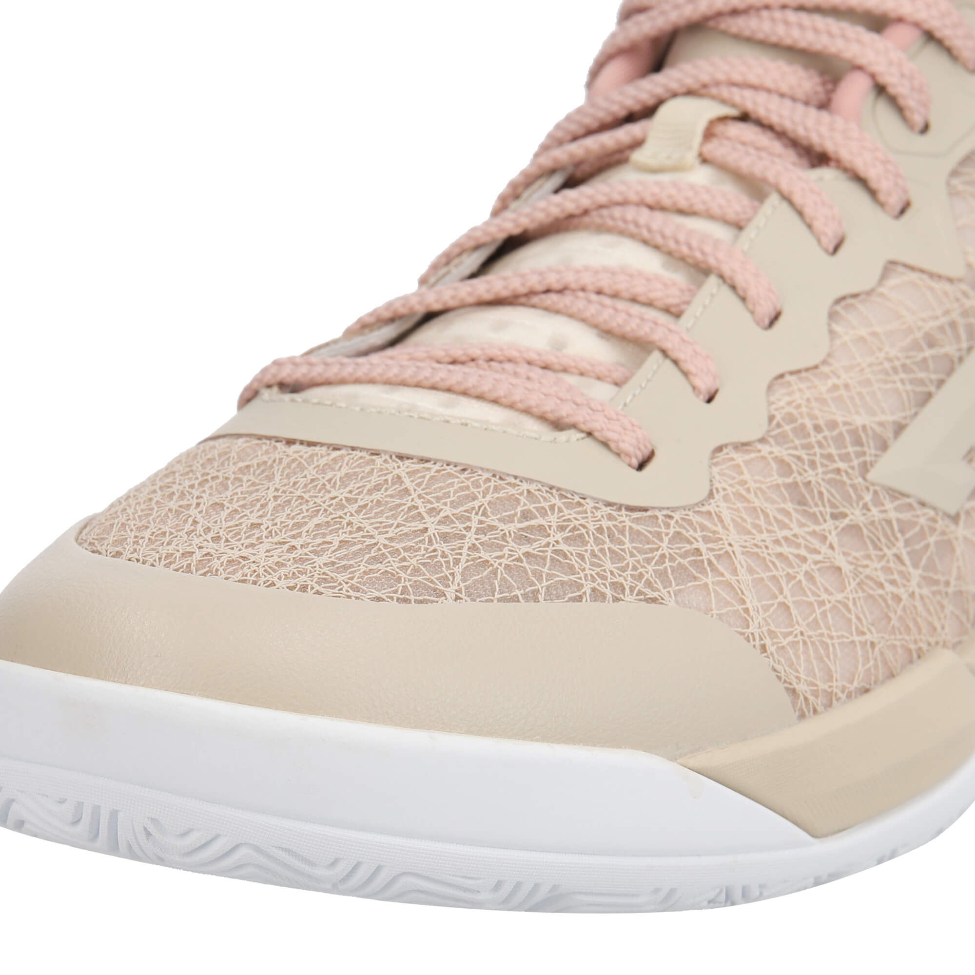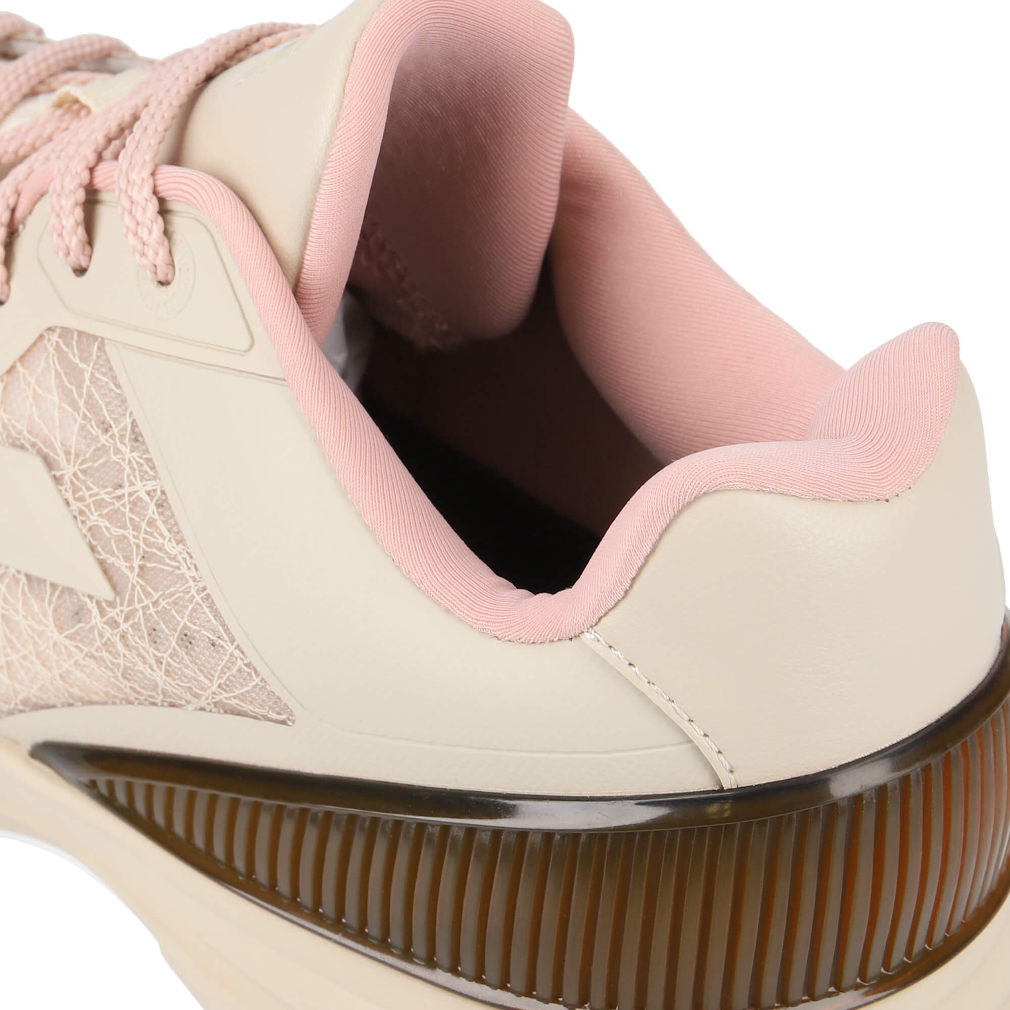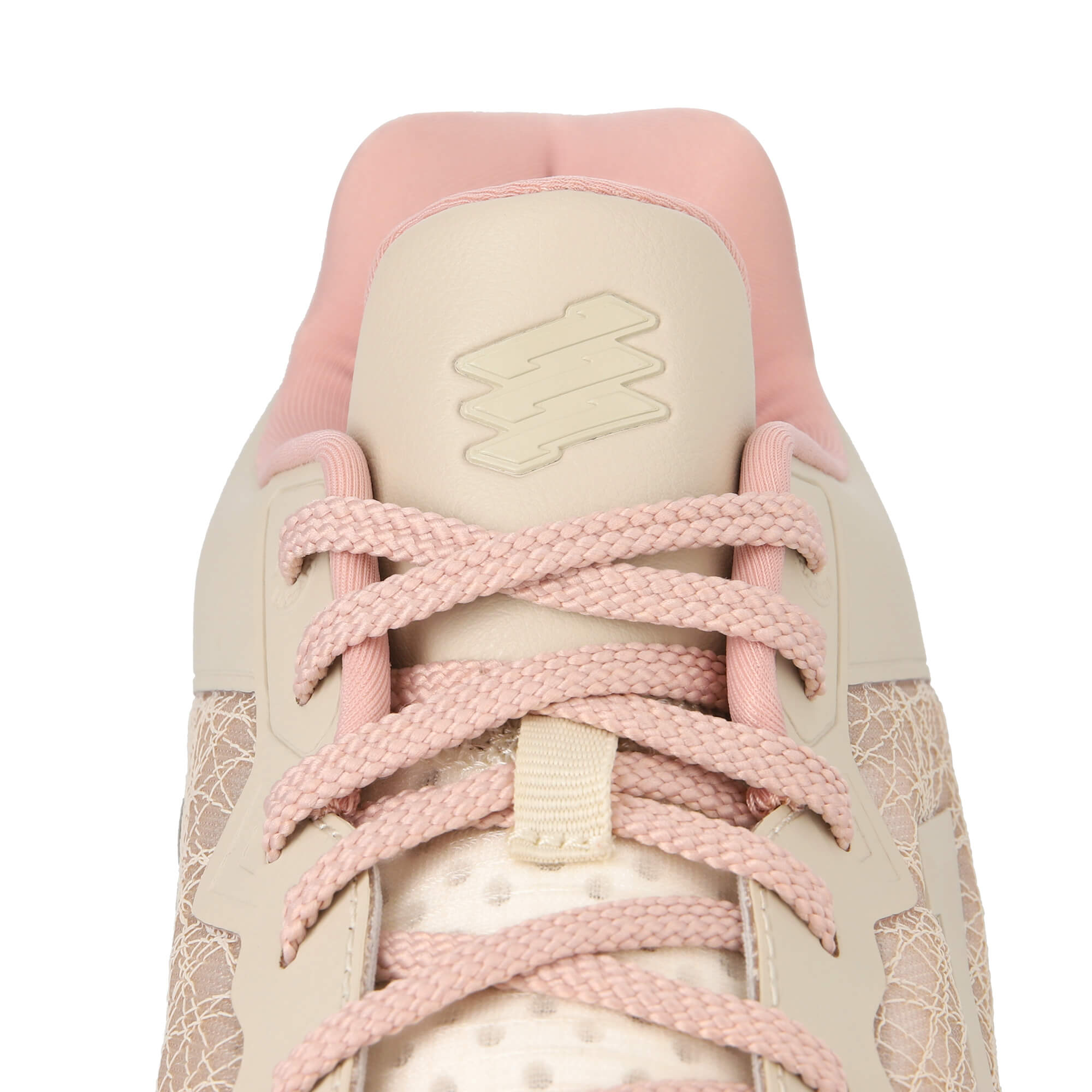 焼き菓子のようなライトベージュをベースに光沢のあるモカブラウンのヒールカウンター。さらにライニングとシューレースにピンクを採用した落ち着いた配色で気品ある印象の配色。魅惑的なプリンセスをイメージしたスウィートなカラー。