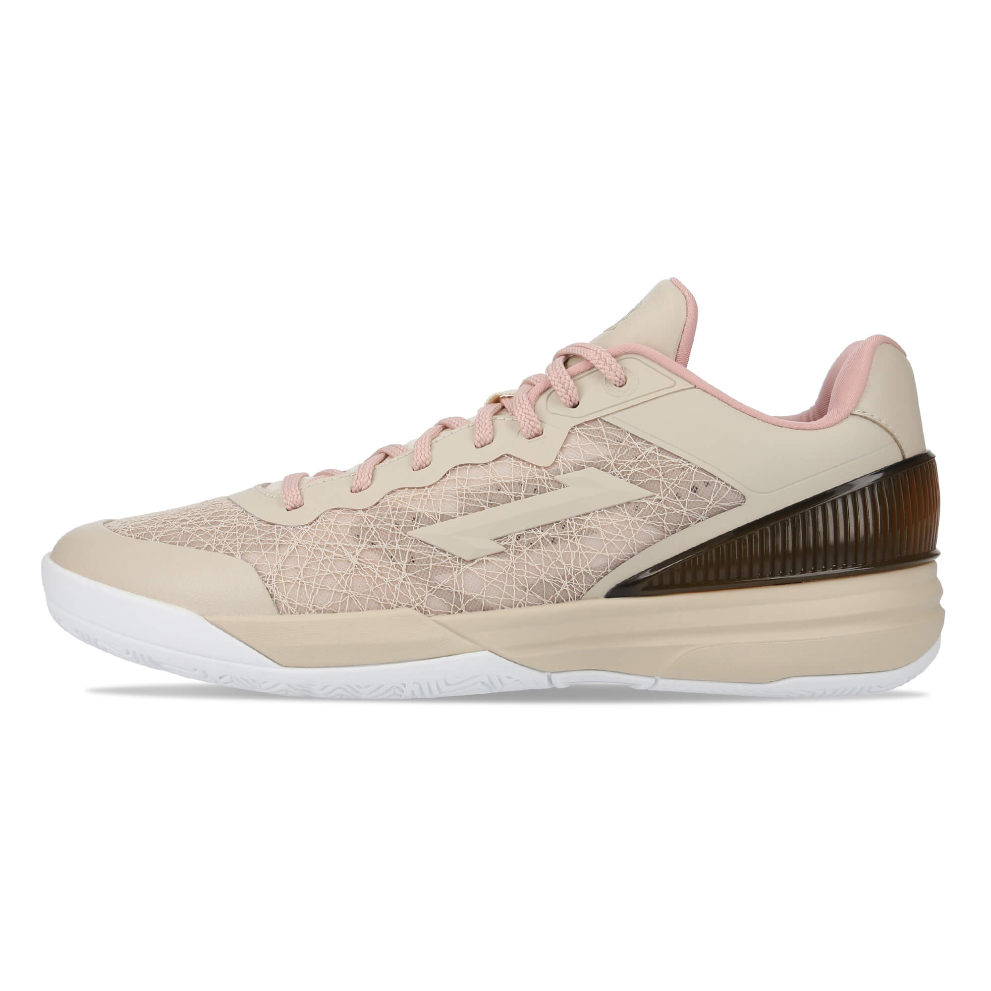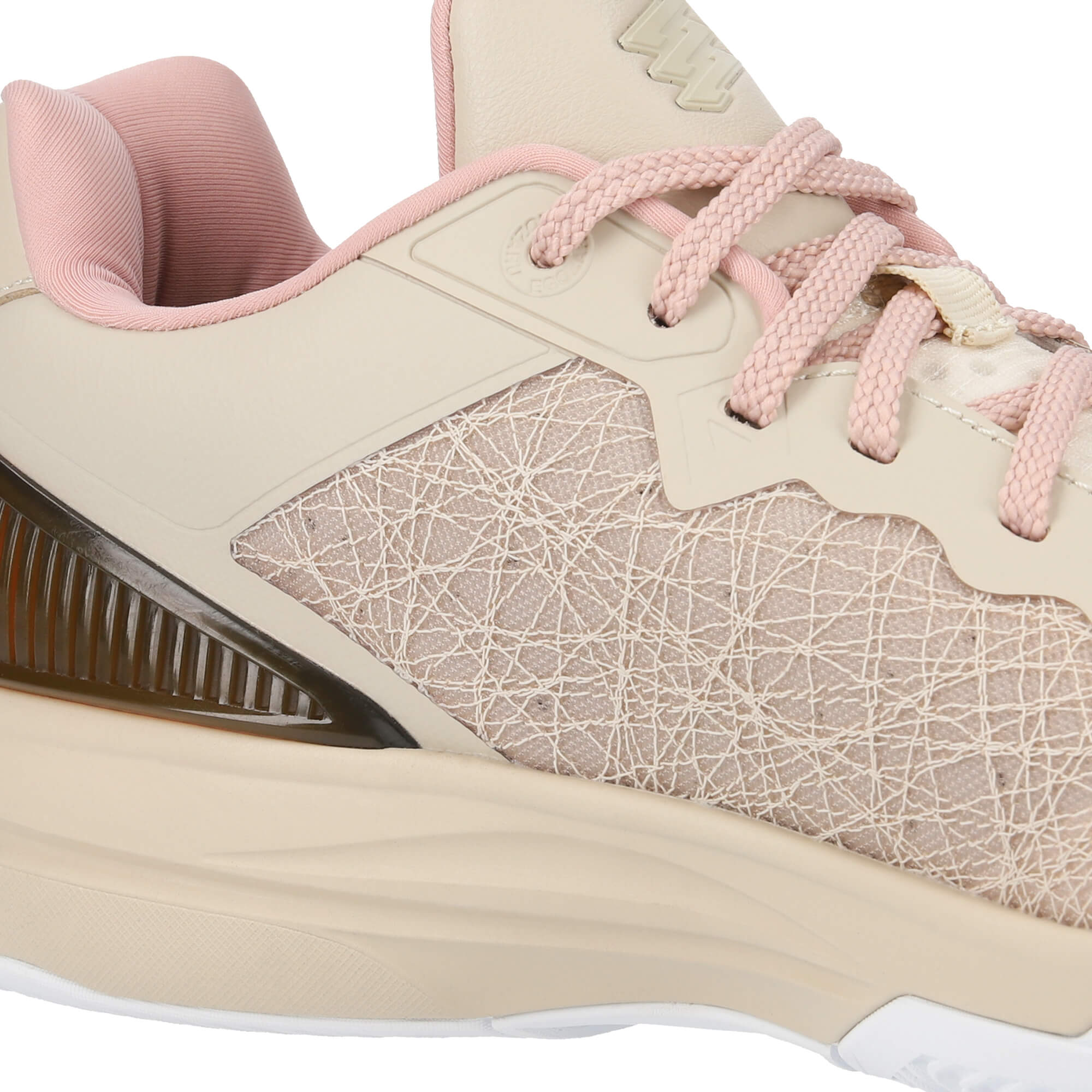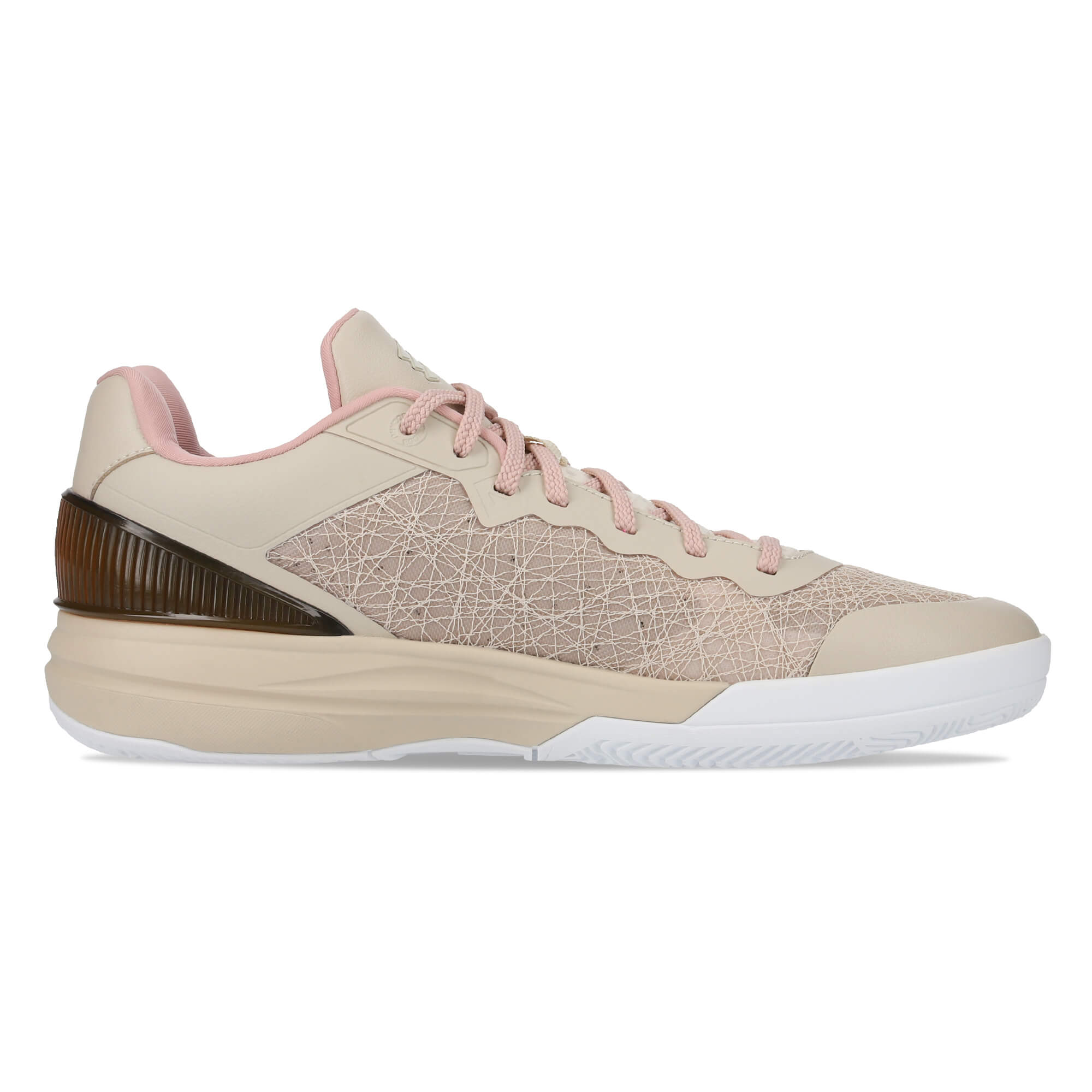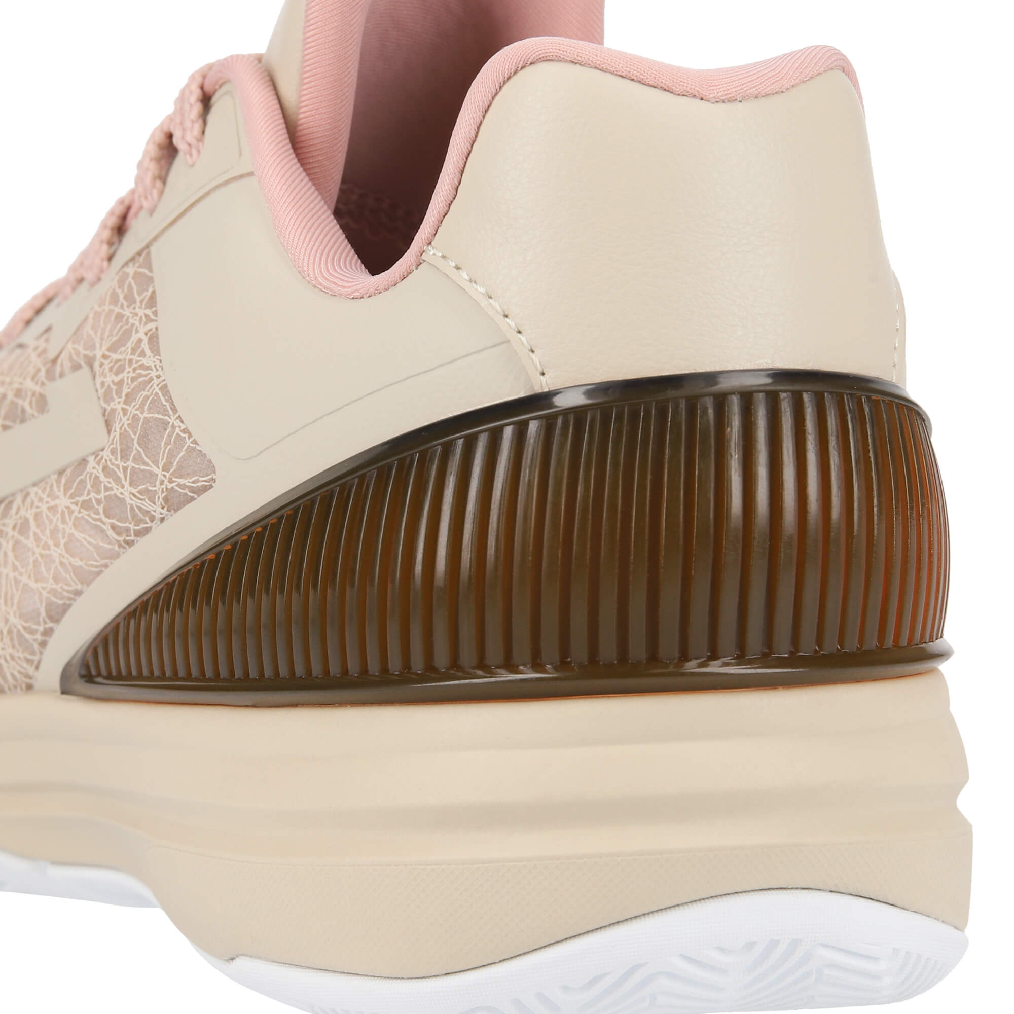 焼き菓子のようなライトベージュをベースに光沢のあるモカブラウンのヒールカウンター。さらにライニングとシューレースにピンクを採用した落ち着いた配色で気品ある印象の配色。魅惑的なプリンセスをイメージしたスウィートなカラー。
