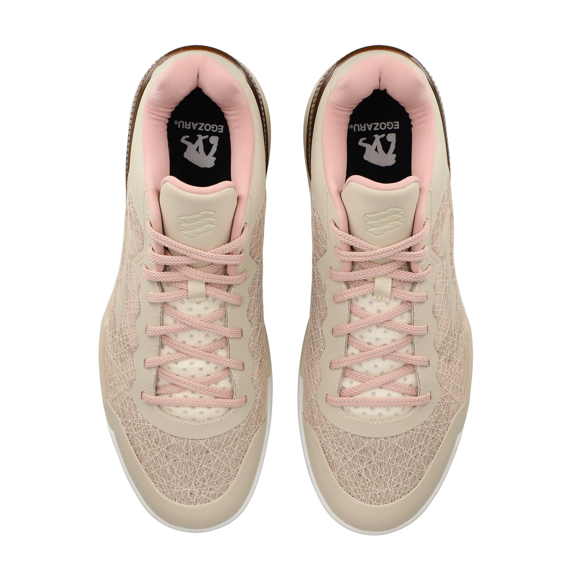 前足部はコートを掴む感覚を最大限活かすために足裏と地面の距離をやや近めに設定。アウトソールは放射状のヘリンボーンパターンを主軸に母指球部分から360°に広がるサークルパターンを採用し高いグリップ性を実現。ストップ&ダッシュ、ピヴォット動作などキレのある鋭い動きを演出。ミッドソール全体はEVA(合成樹脂)、前足部と踵部分にEVAとは硬度の異なる独自開発高反発フォーム”EGO DOOON”(エゴドーン)を配し、前足部は接地感を活かす適度な反発性、踵部はクッション性を実感できる構造。さらに、中間層にねじれを抑制するシャンクプレートを内蔵。ヒールカウンターは1stモデルEGO AWAKEのデザイン要素を継承しつつ、素材をTPU(熱可塑性ポリウレタン)素材に変更。優れた剛性で競技者の足元を強力にサポートし徹底的に踵のブレを抑制。