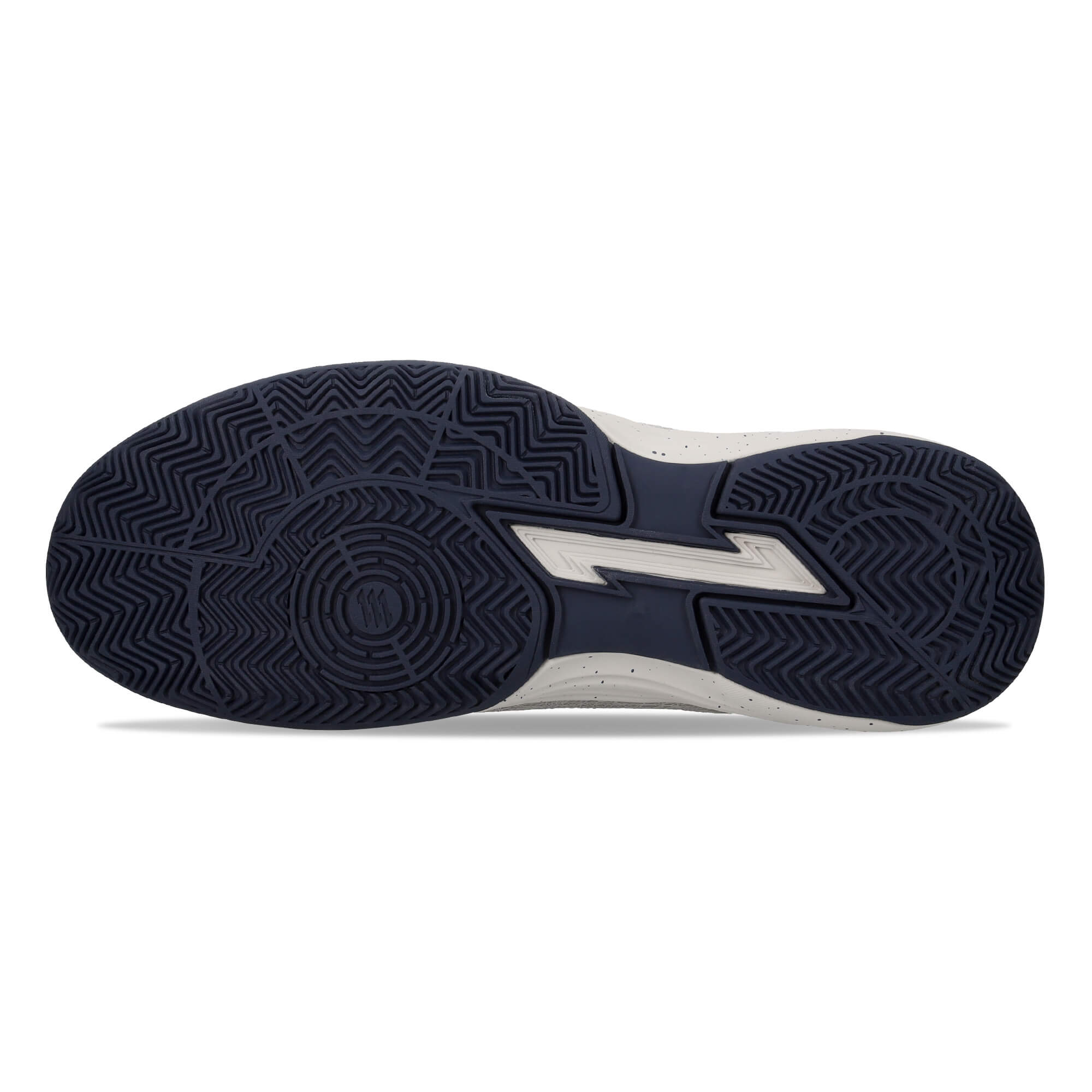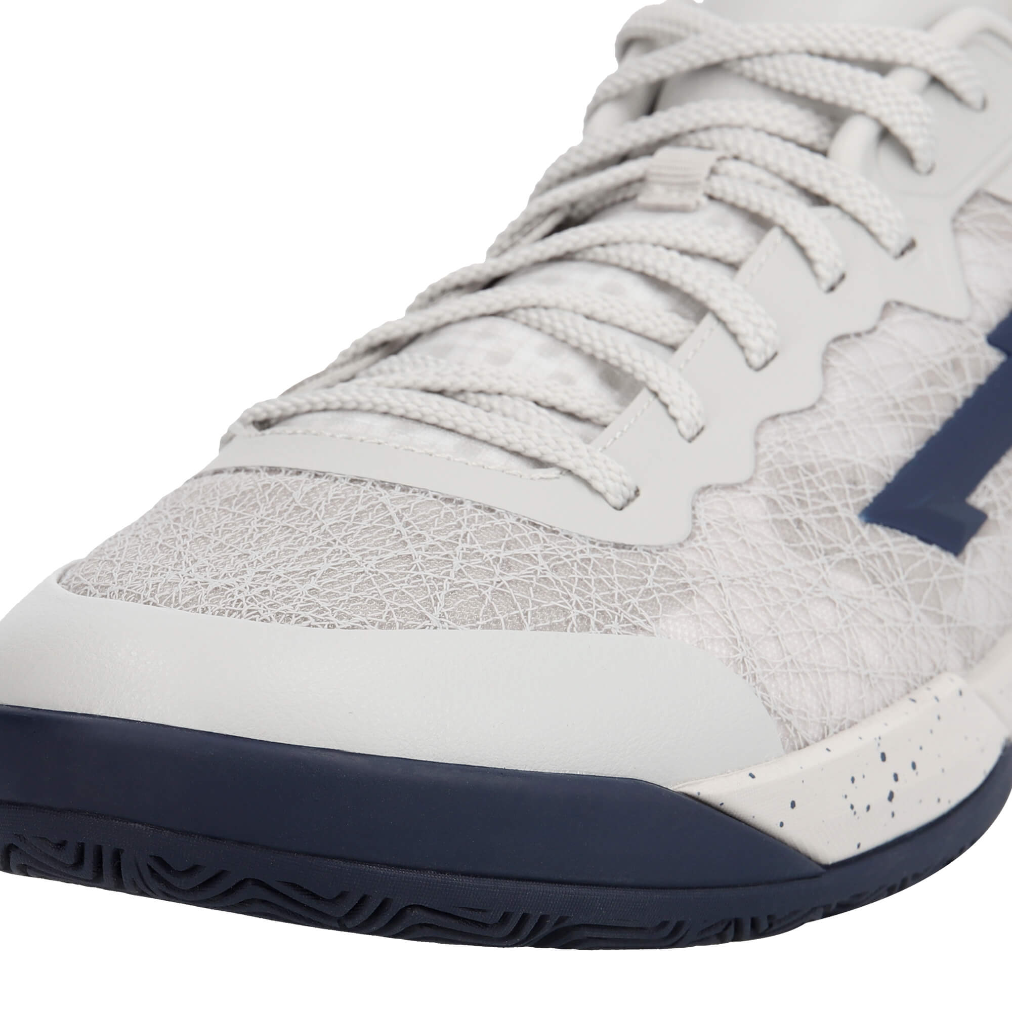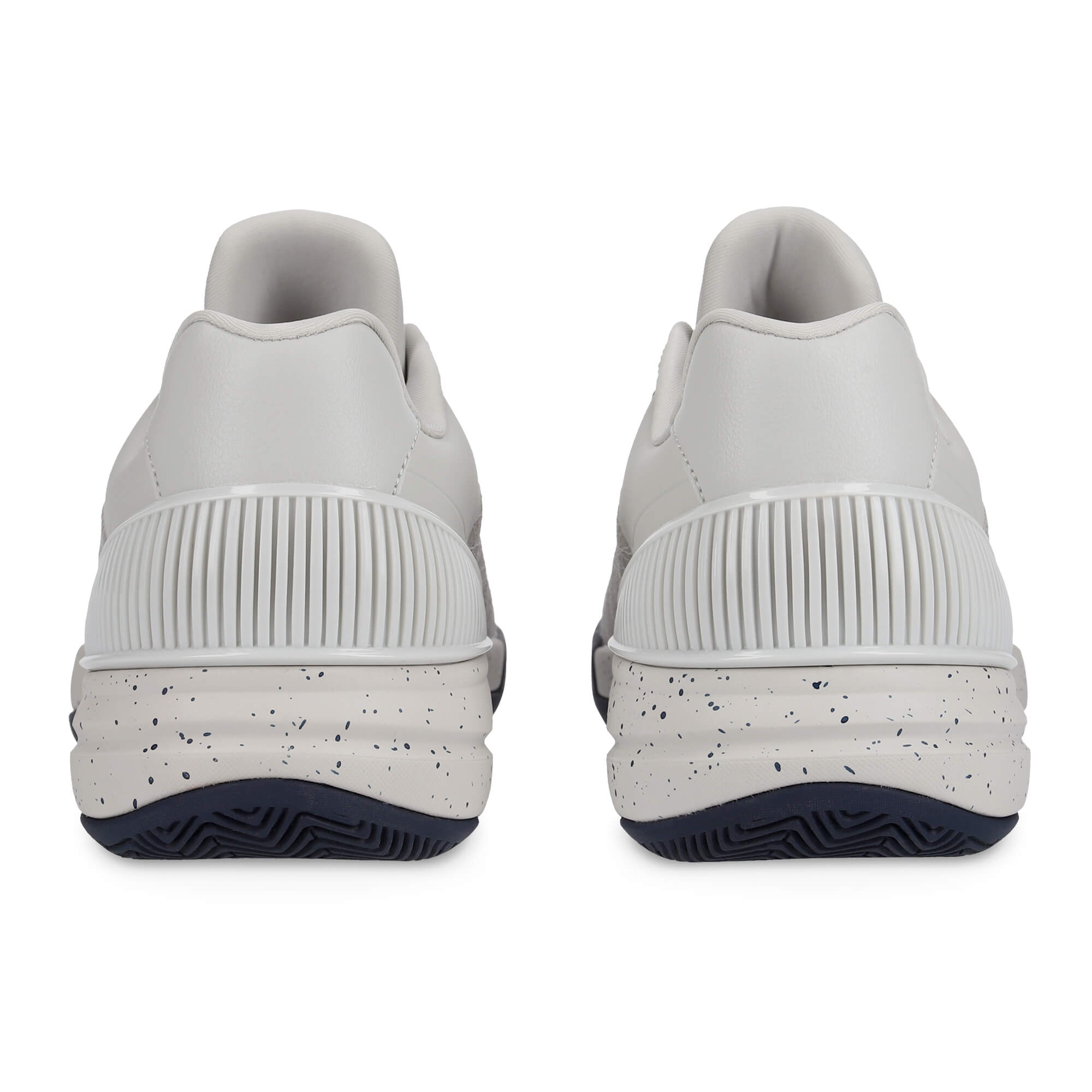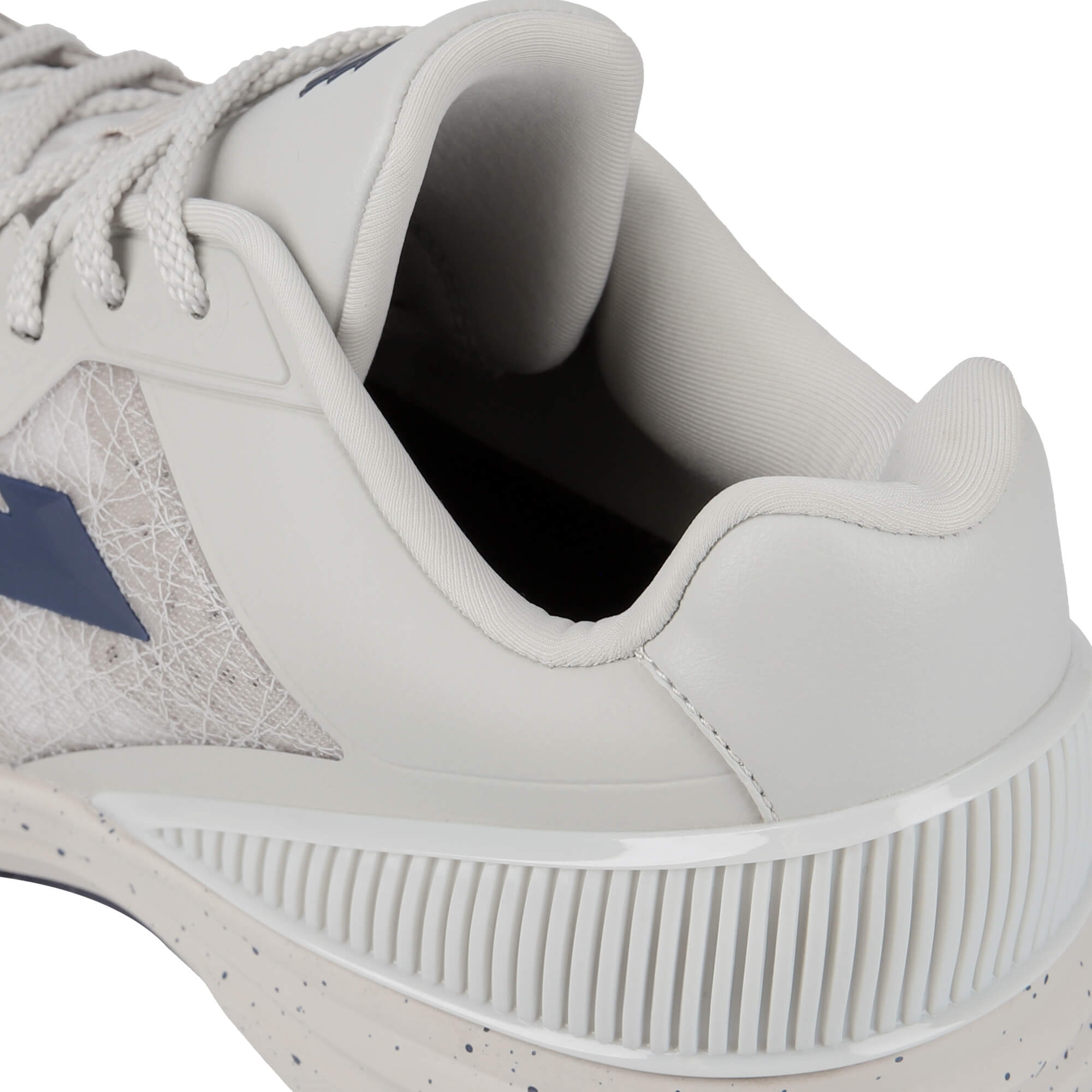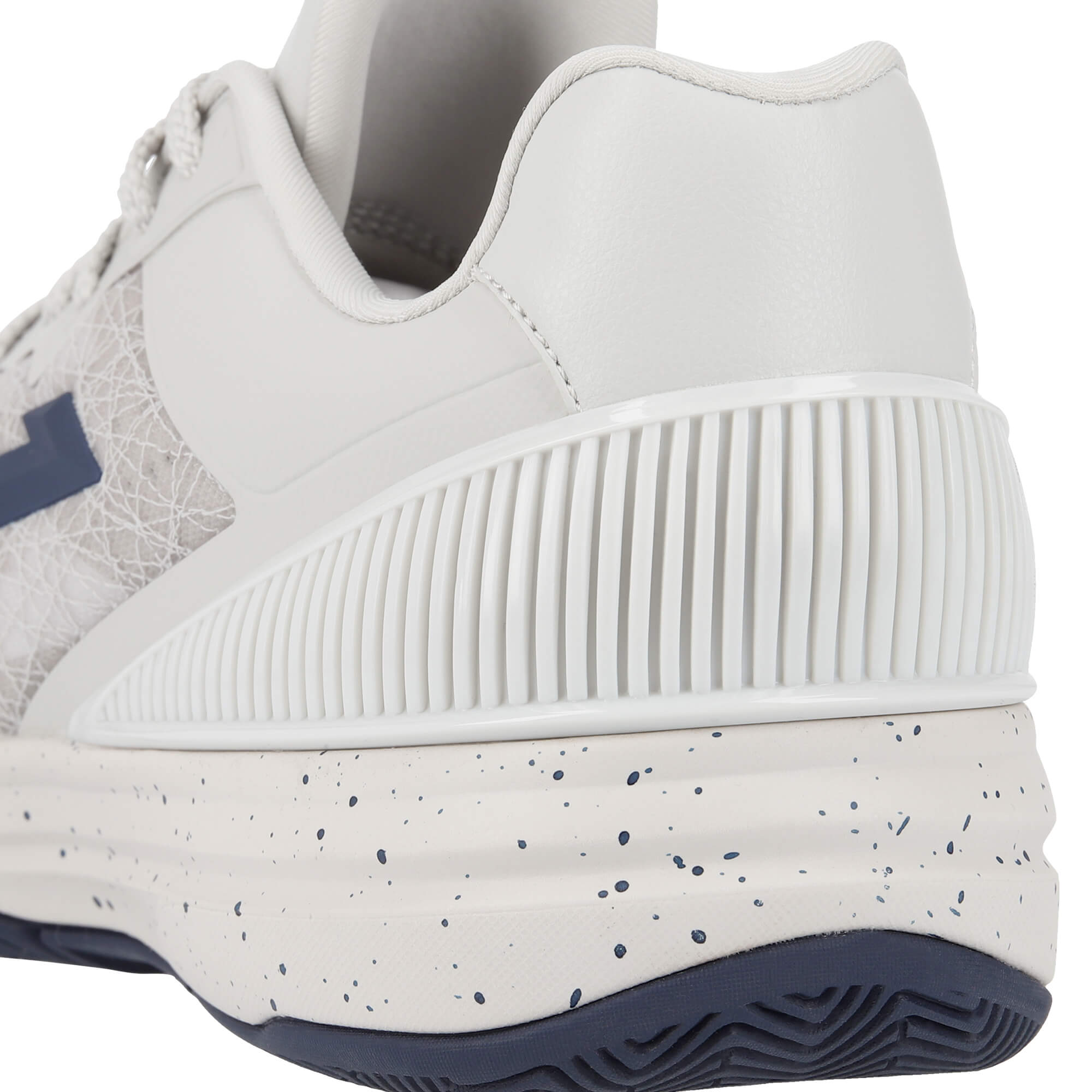 前足部はコートを掴む感覚を最大限活かすために足裏と地面の距離をやや近めに設定。アウトソールは放射状のヘリンボーンパターンを主軸に母指球部分から360°に広がるサークルパターンを採用し高いグリップ性を実現。ストップ&ダッシュ、ピヴォット動作などキレのある鋭い動きを演出。ミッドソール全体はEVA(合成樹脂)、前足部と踵部分にEVAとは硬度の異なる独自開発高反発フォーム”EGO DOOON”(エゴドーン)を配し、前足部は接地感を活かす適度な反発性、踵部はクッション性を実感できる構造。さらに、中間層にねじれを抑制するシャンクプレートを内蔵。ヒールカウンターは1stモデルEGO AWAKEのデザイン要素を継承しつつ、素材をTPU(熱可塑性ポリウレタン)素材に変更。優れた剛性で競技者の足元を強力にサポートし徹底的に踵のブレを抑制。