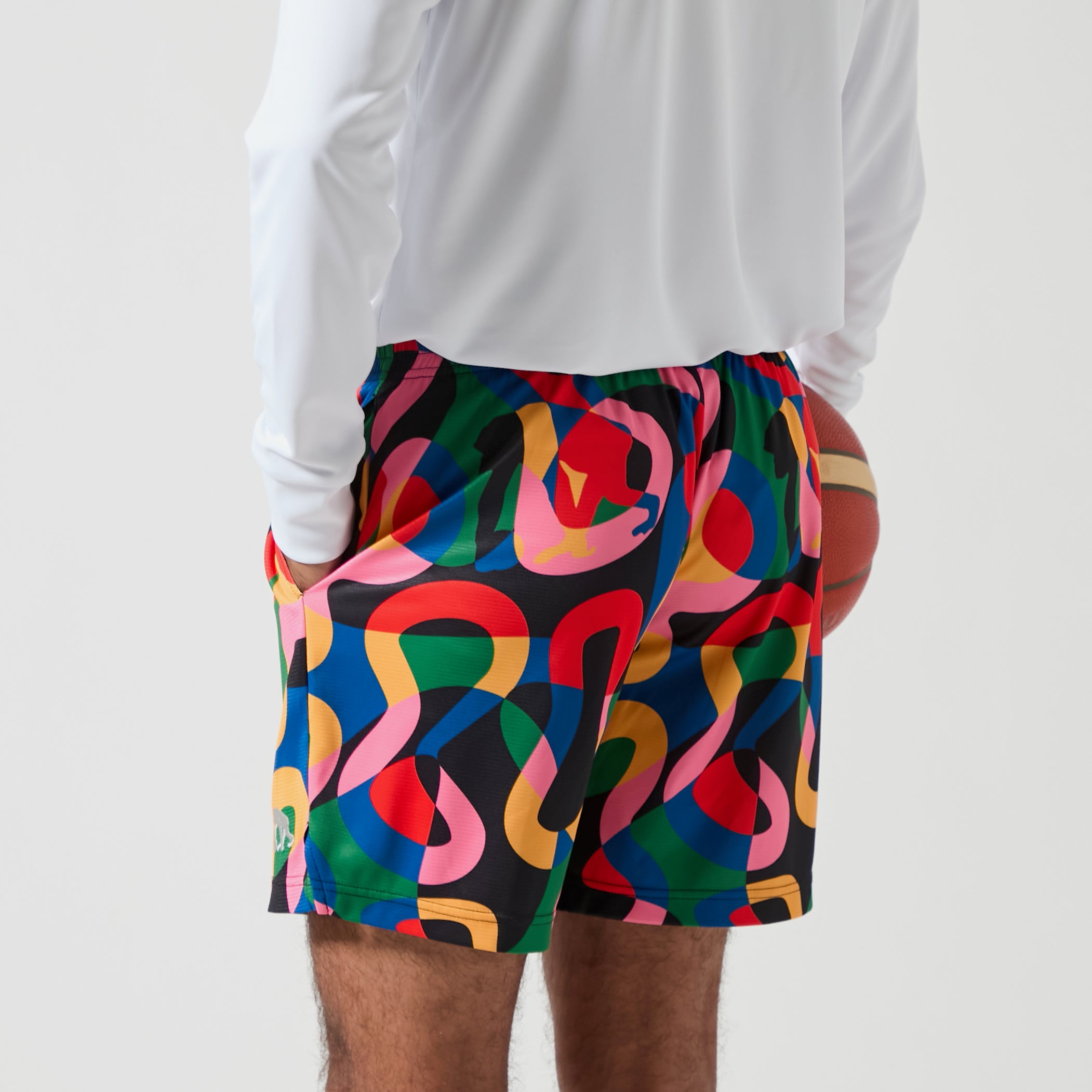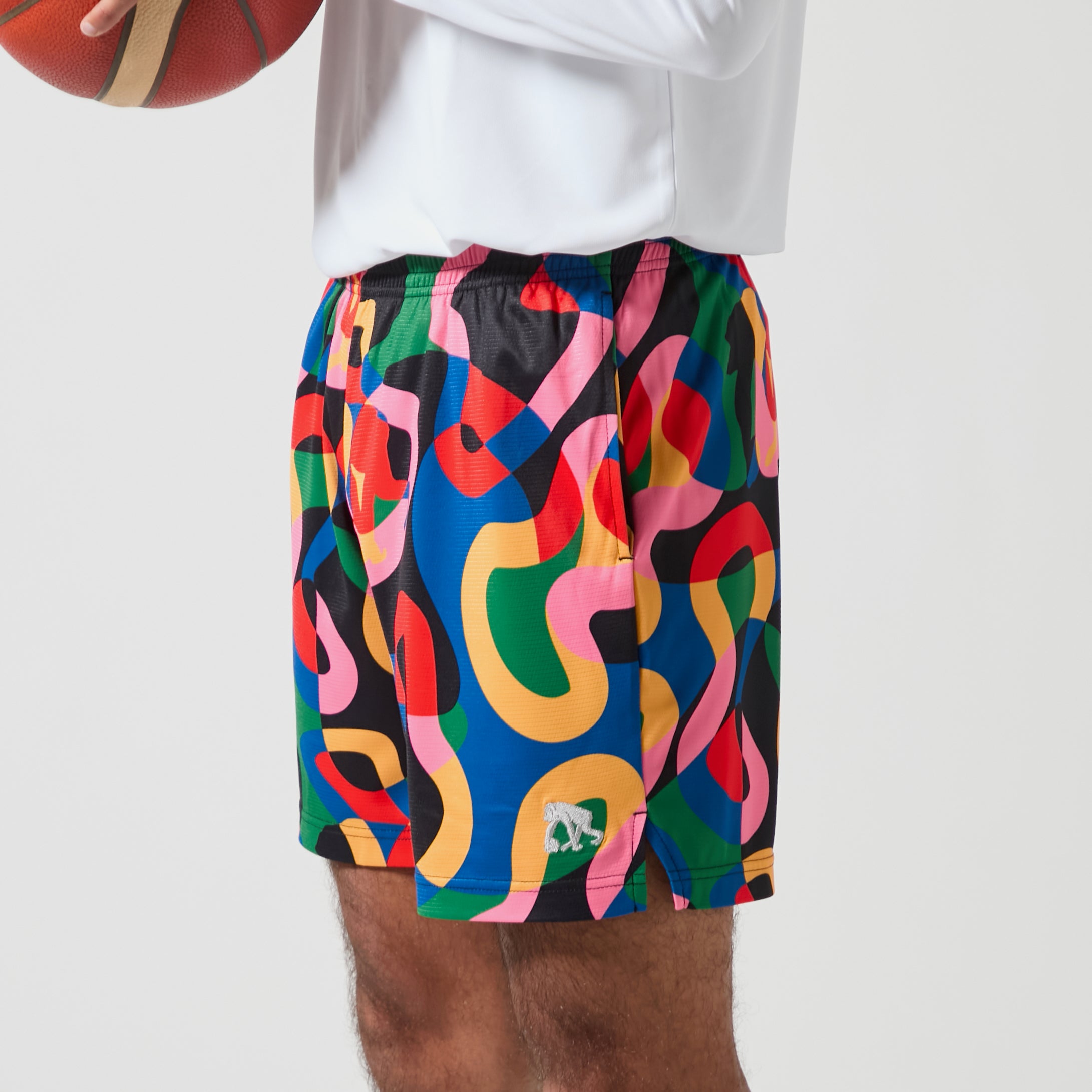 カラフルなポップパターン柄を全面に配した、ひざ上丈シルエットのショートパンツ。