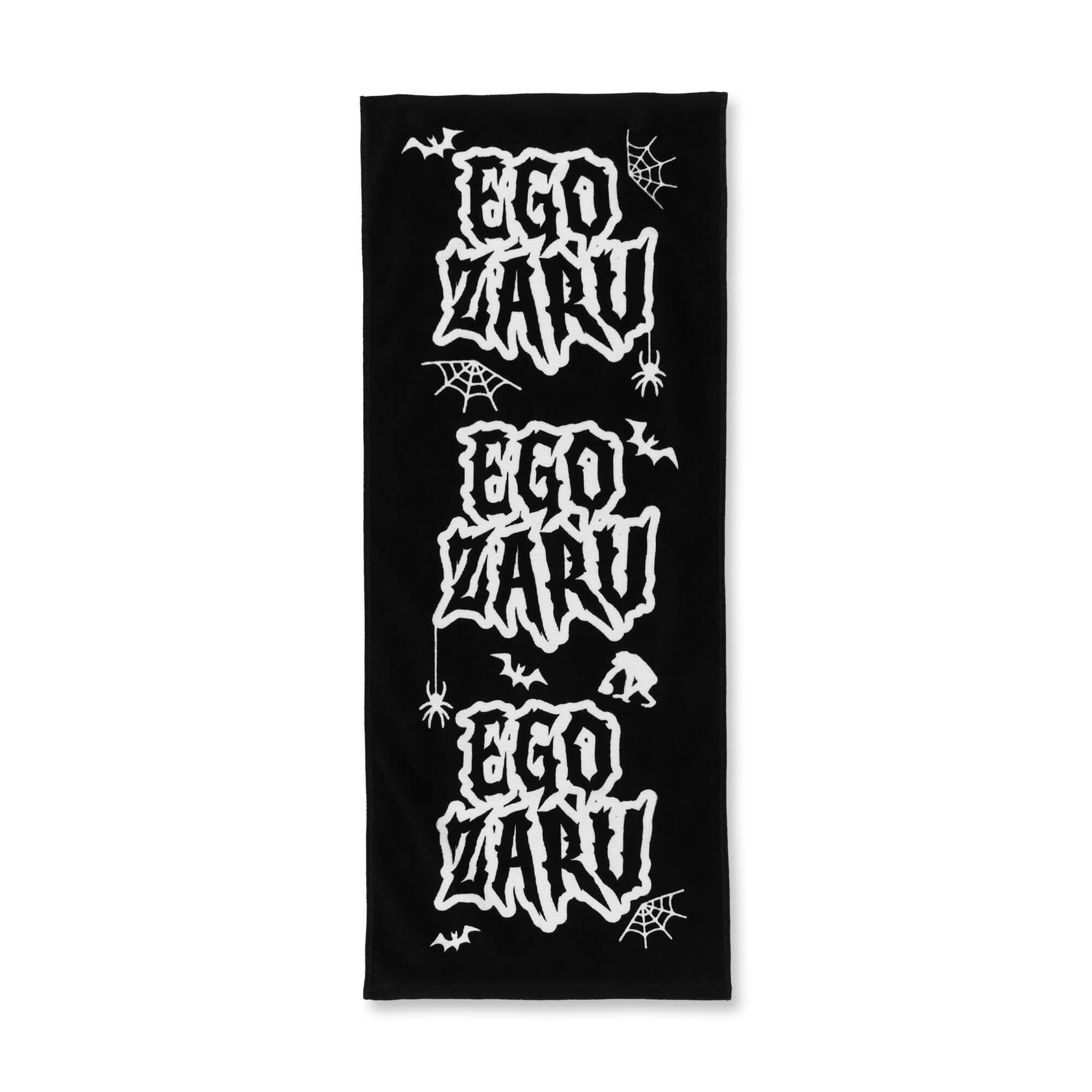 コウモリや蜘蛛の巣などのホラーテイストのグラフィックを配したスポーツ用フェイスタオル。